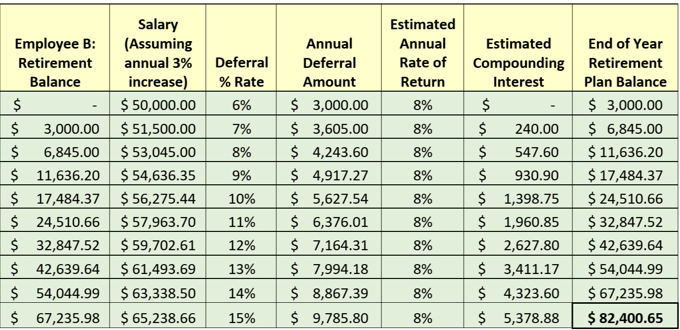 Employee B also earns an annual salary of $50,000 and decides to start out with a deferral amount of 6% but decides to increase their deferral amount by 1% each year! Also earning estimated annual rate of return of 8% each year. After 10 years of deferring with 1% increases each year, their estimated balance is $82,400.65.