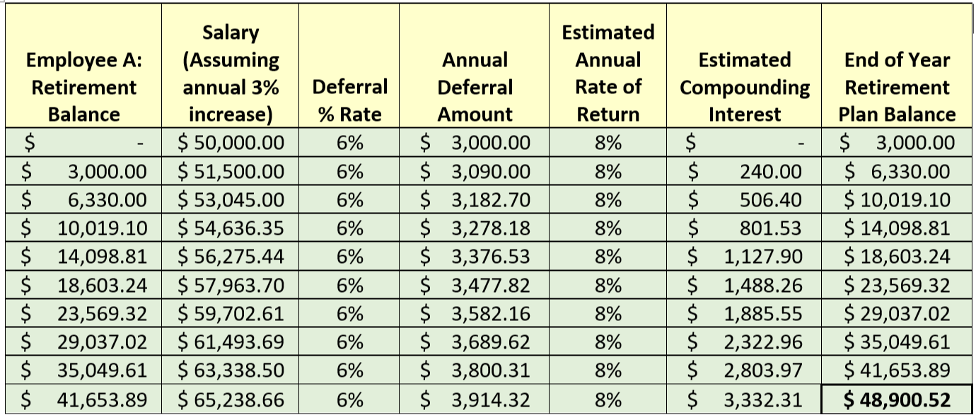 Employee A earns an annual salary of $50,000, decides to defer 6% of their salary, and earns an estimated annual rate of return of 8% each year. Keep in mind that some years the rate of return might be more than 8% and, in some years, less. This is just a hypothetical illustration. After 10 years of deferring at the 6% rate, their estimated balance is $48,900.52.